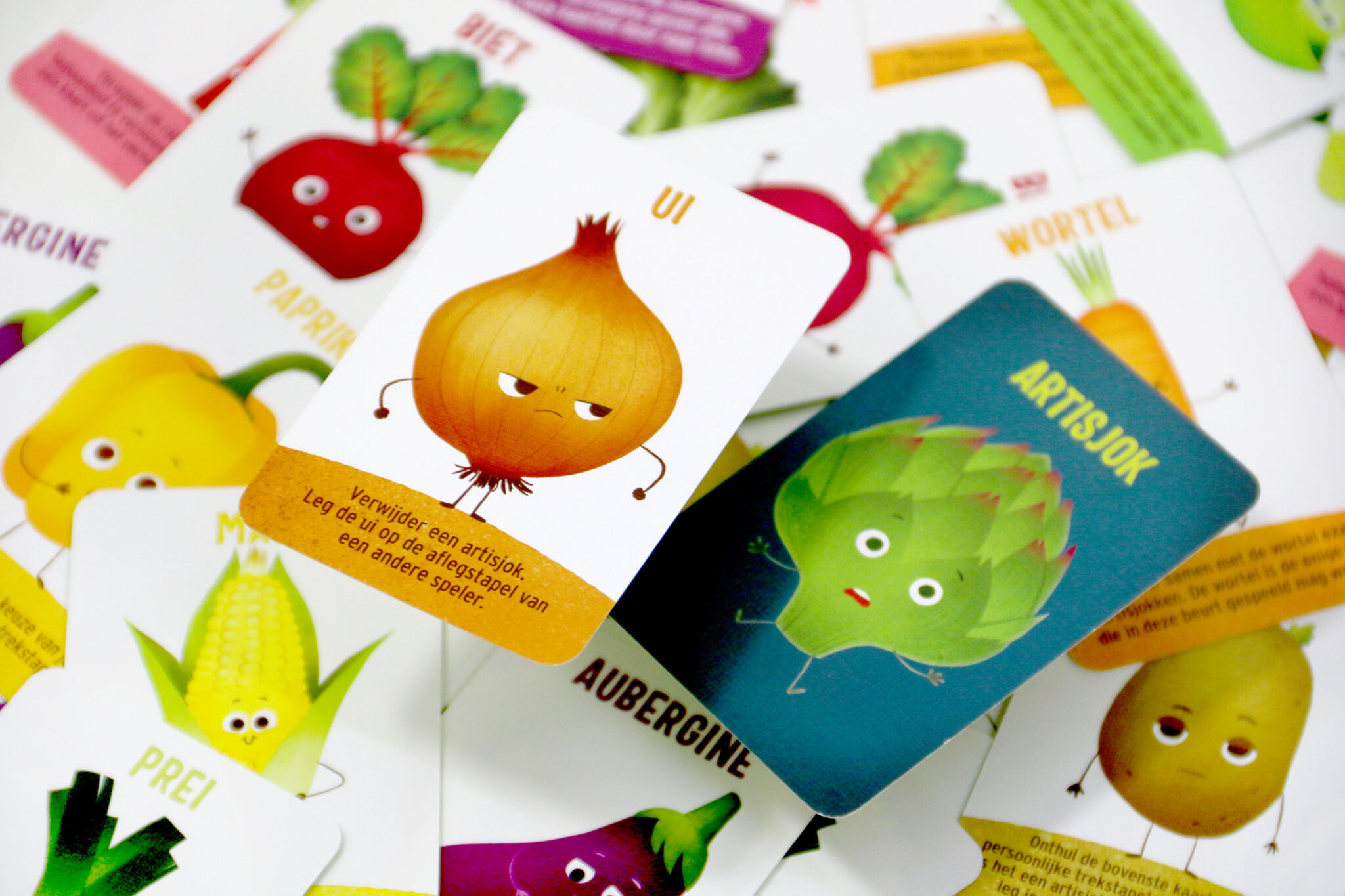 Je vindt in dit spel verschillende kaarten met prachtig artwork. In de groentetuin vind je naast artisjokken ook broccoli, prei, aubergine, bietjes, mais, aardappel, wortel, ui, paprika en tuinbonen. Als extraatje groeit er nu ook rabarber in de tuin. Elke groente heeft een eigen ‘kracht’. Sommige helpen je de artisjokken te verwijderen, sommigen zorgen ervoor dat je er meer krijgt.