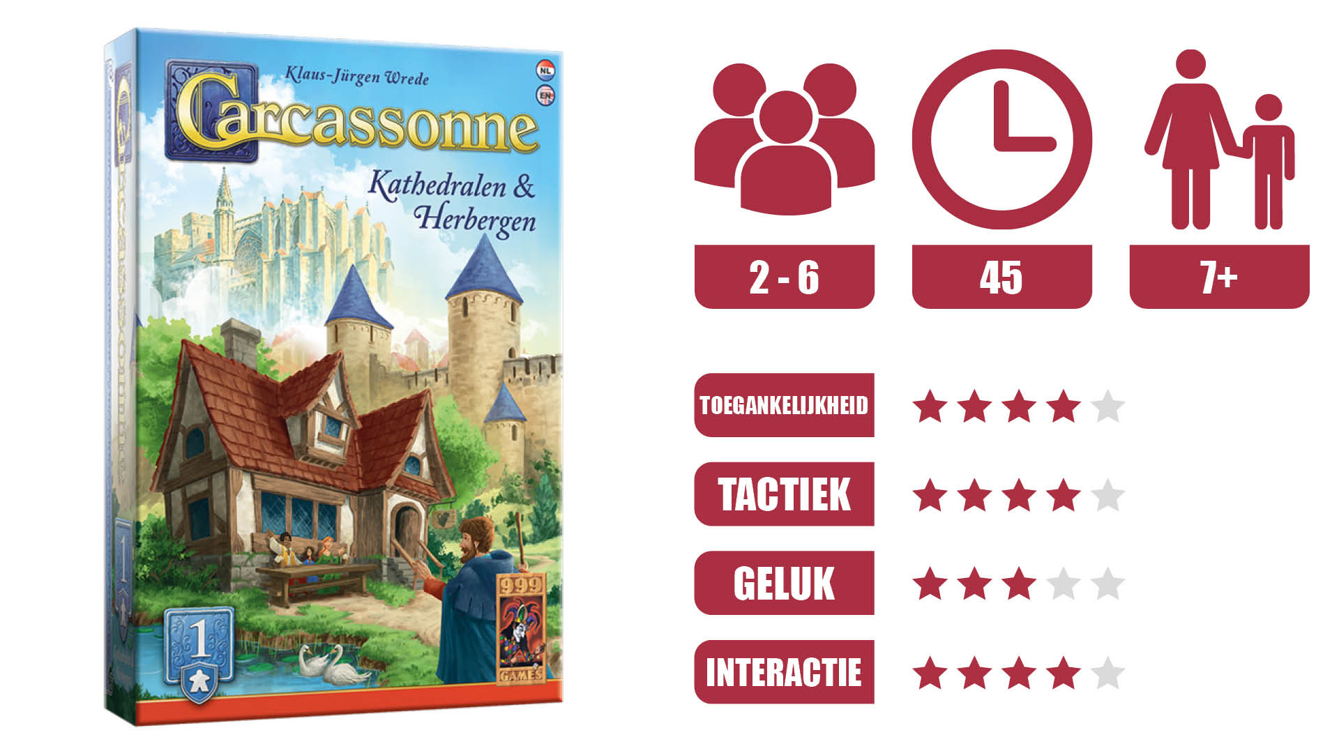 In deze uitbreiding op Carcassonne maak je je wegen en steden nog mooier door er nuttige herbergen en kathedralen in te zetten, die nog meer punten opleveren! De grote meeple geeft je daarnaast extra kracht om meerderheden te behalen en dankzij de roze meeples kun je nu ook met 6 spelers spelen!