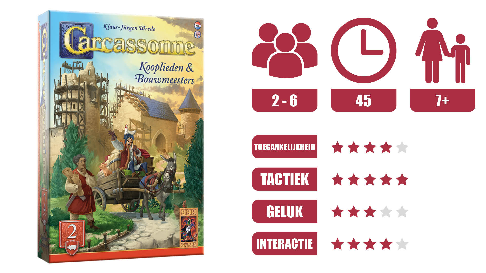 In deze uitbreiding op Carcassonne komen handelaren en bouwmeesters naar de steden. Verzamel de meeste handelswaren van een type en zet je varken op de weilanden om extra punten te verdienen. De bouwmeester versnelt bovendien de bouw van je wegen en steden.
