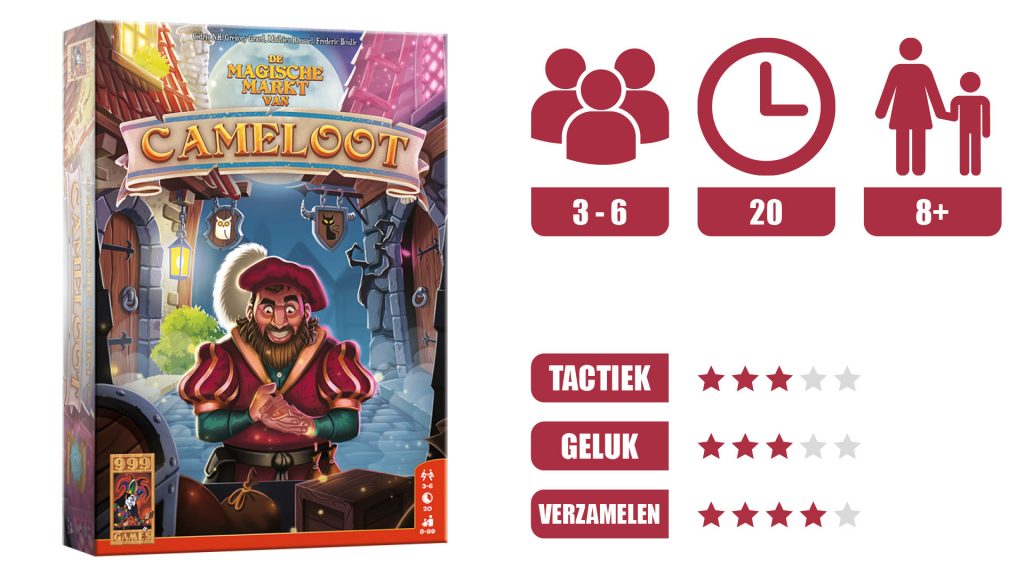 Je speelt Cameloot met 3 t/m 6 personen, een potje duurt zo’n 20 minuten en het spel is geschikt vanaf 8 jaar. Hoe meer spelers er meedoen hoe uitdagender (en dus leuker) het spel wordt. Maar met z’n drieën is het ook erg goed te spelen. Doordat de spelregels erg eenvoudig zijn, een potje niet te lang duurt en er een laagdrempelige tactische laag in het spel zit, is het uitermate geschikt als familiespel met kinderen of voor casual spelers. De meer ervaren (tactische) spelers raken waarschijnlijk snel uitgekeken op Cameloot.