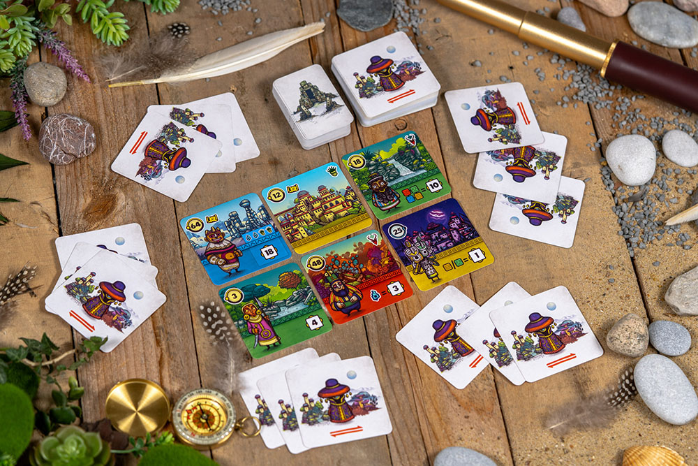 - Exploratietijd: Elke kaart heeft een getal dat de duur van je verkenning aangeeft. Speel je een hogere waarde dan je vorige kaart, dan ontdek je een Heiligdom en krijg je een extra kaart met een bonus of zijmissie.
