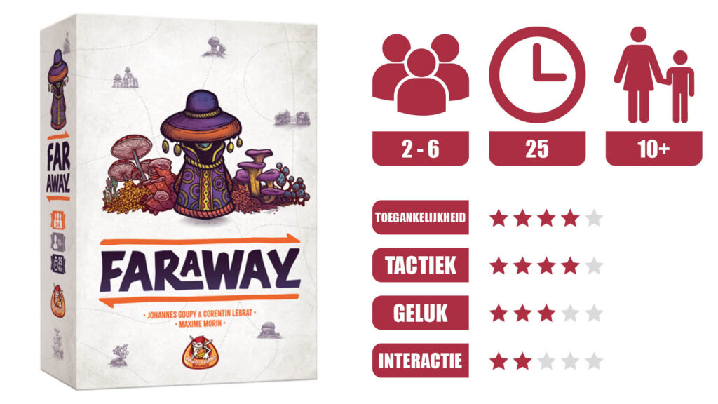 Faraway is vooral geschikt voor spelers die houden van een compact en thematisch kaartspel waarbij je slim moet plannen, maar niet urenlang hoeft te puzzelen. Het spel speelt lekker vlot, waardoor het ideaal is als tussendoortje op een spelletjesavond of als opener voor een langere spelsessie. Als je het leuk vindt om elke keer weer een andere reis uit te stippelen en daarbij verrast te worden door onverwachte wendingen, zit je hier goed.