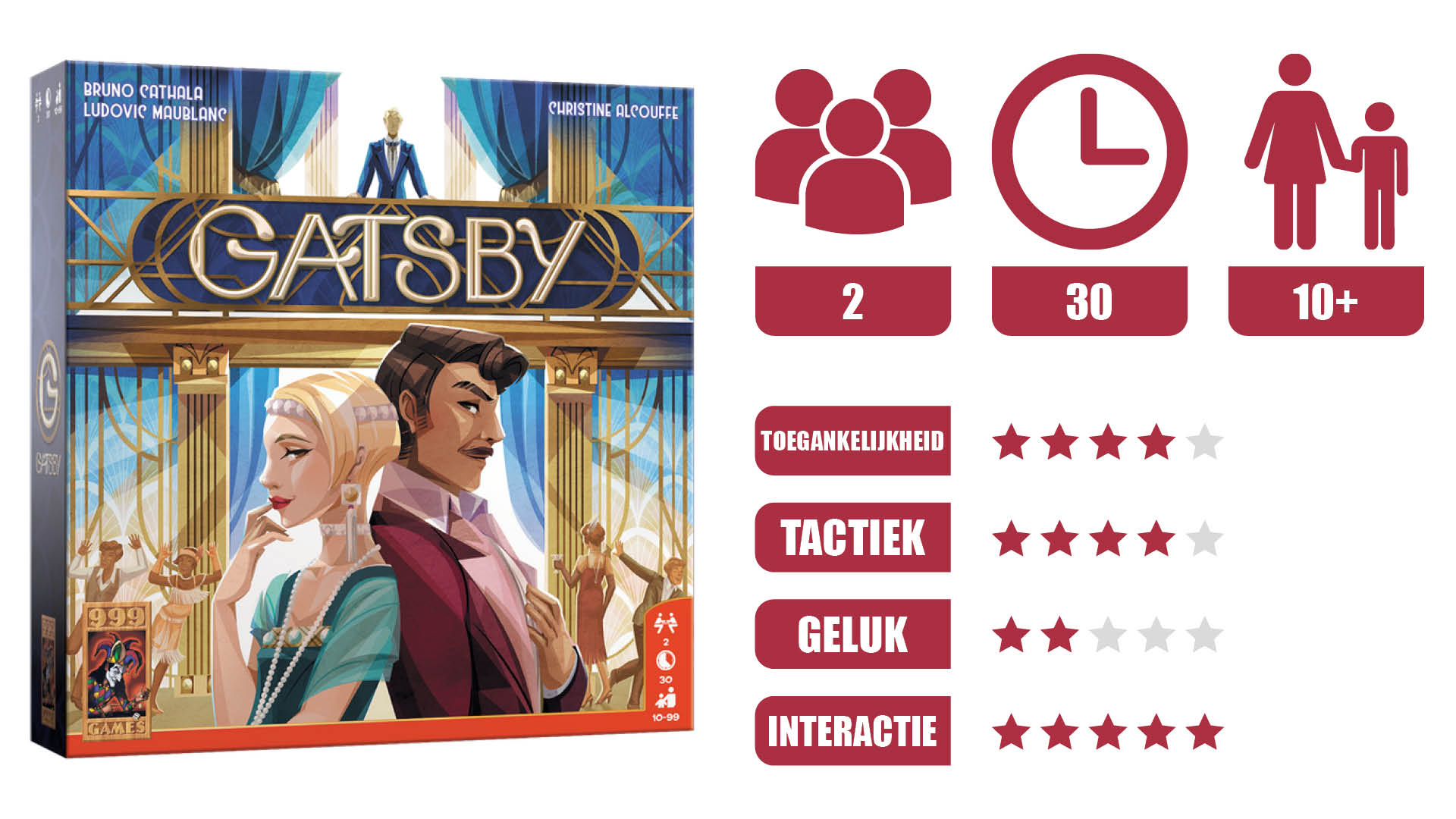 Speel tegen elkaar als de ambitieuze Dorothy of James in dit tactische tweespelersspel. Gatsby is een spel met interactie, dramatische wendingen en voortdurende spanning. Kun jij de gedachten van je tegenstander lezen en de gunst van de legendarische Jay Gatsby bemachtigen?