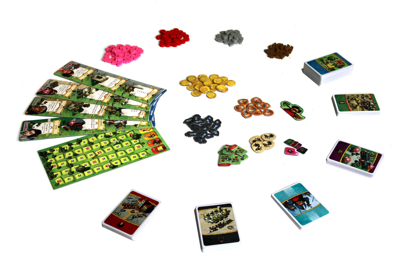 Volle doos, value for money: de doos is gevuld met meer dan 200 honderd kaarten, ruim 100 houten speelstukken en 50 fiches.