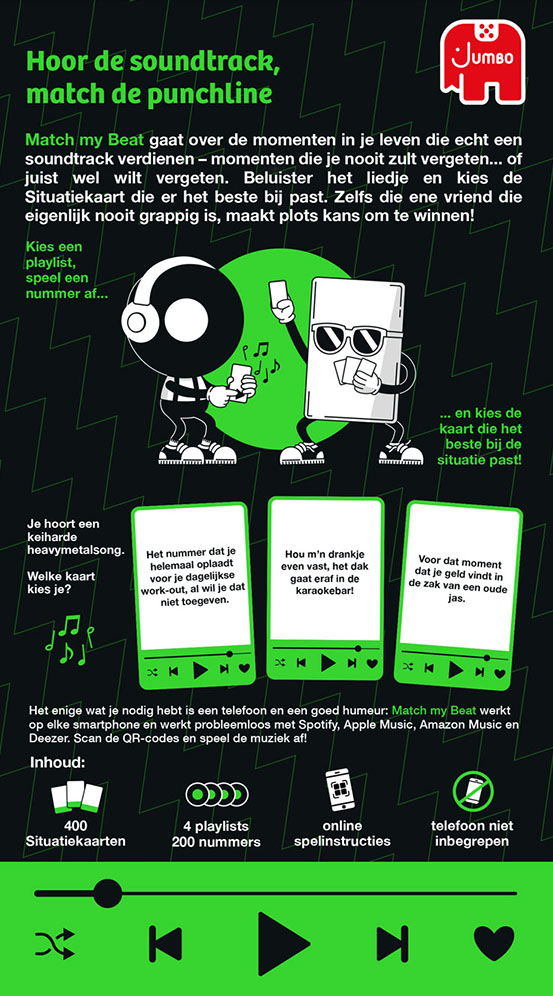 Match My Mood, Match My Party, Match My Past en Match My Heart. Deze bepalen vanuit welke invalshoek je speelt. - QR-codes / playlists (4 playlists, 200 nummers)