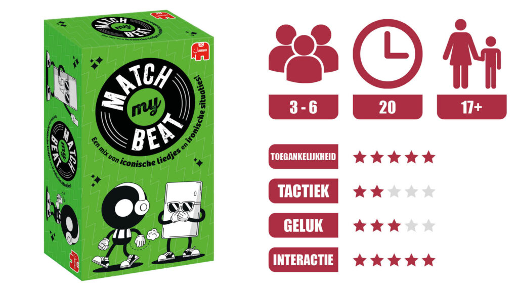 Match My Beat is zo’n spel dat je het liefst speelt met mensen die niet bang zijn om een beetje los te gaan. Je hoeft geen muziekkenner te zijn, maar het helpt wel als je openstaat voor herkenning, humor en een beetje zelfspot. Dit is typisch een spel dat het goed doet in gezelschap: vrienden, familie, feestjes of een spelavond waar het vooral gezellig moet zijn en niet te serieus.
