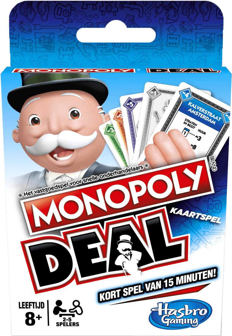 Het Monopoly Deal Kaartspel is alle Monopoly-pret in een snel te spelen kaartspel. Het wordt geleverd met 110 kaarten, waaronder bezittingkaarten, huurkaarten, huis- en hotelkaarten en jokers. Op de actiekaarten staat wat een speler moet doen, zoals het betalen van huur of het sluiten van gevaarlijke deals. Huis- en hotelkaarten verhogen de huurwaardes. Met jokers kunnen spelers bezittingsets bouwen. En spelers betalen hun schulden met geldkaarten.
