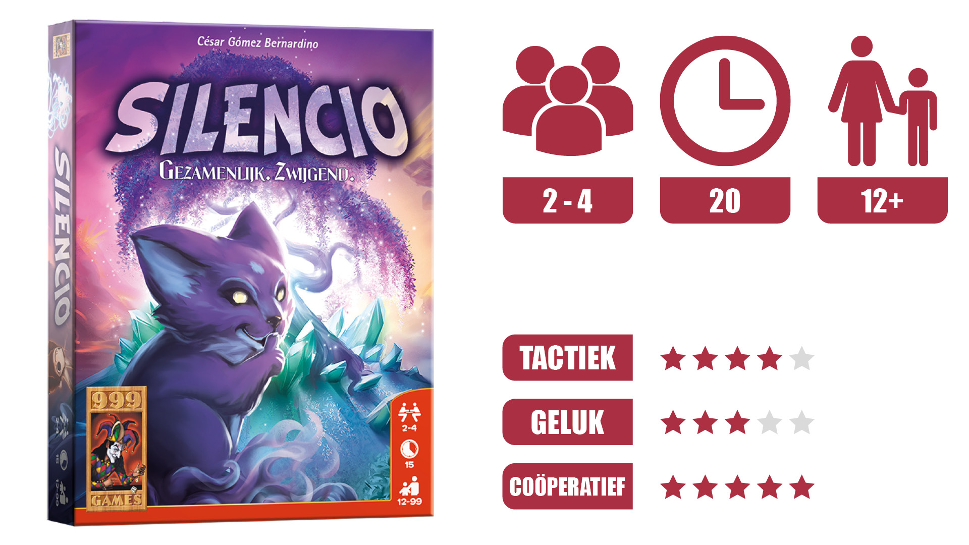 Silencio is een snel kaartspel waarbij je samen zoveel mogelijk reiskaarten moet afleggen. Als team maak je een reis door een wonderlijke wereld vol bossen, moerassen, savanne en lava. Dit doe je door kaarten in dezelfde kleur op elkaar aan te sluiten. Maar pas op: niemand mag geluid maken! Zodra iemand iets zegt, heeft iedereen verloren.